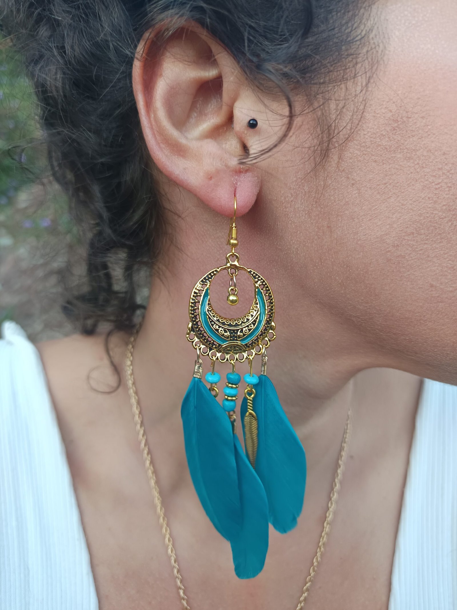 La delicadeza de estos pendientes se manifiesta en su diseño, donde una media luna dorada resplandece, evocando la conexión celestial que une lo terrenal con lo divino. Disponibles en variantes que van desde plumas negras, turquesas, multicolor hasta blancas, cada opción refleja la diversidad y la armonía del universo. Las plumas colgantes, que se deslizan con gracia, añaden un toque de movimiento y vida, mientras que las cuentas, cuidadosamente elegidas, dan un matiz vibrante a la composición, creando un equilibrio perfecto entre elegancia y frescura.