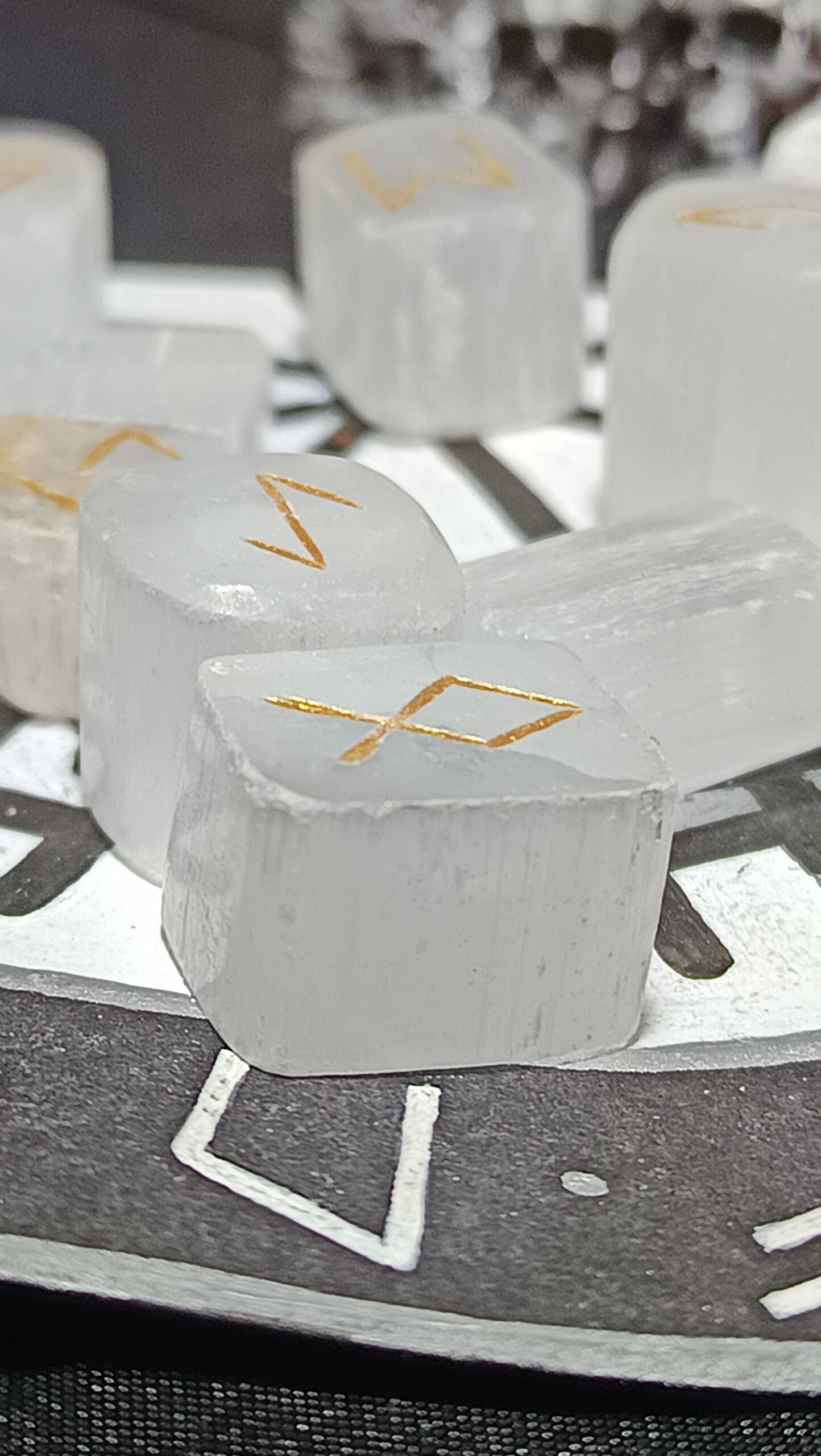 El conjunto incluye las 24 runas del Futhark Antiguo, grabadas en dorado sobre cristal natural de selenita, cuidadosamente talladas y pulidas para conservar su brillo lunar característico.